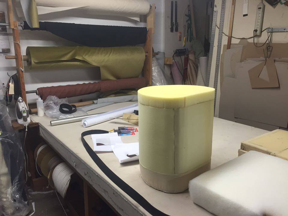 The piece has a wooden interior frame with injection molded foam covering the piece, keeping the weight down. The back is covered with leather vinyl to add another level of protection when it is used as a backrest on the ground.